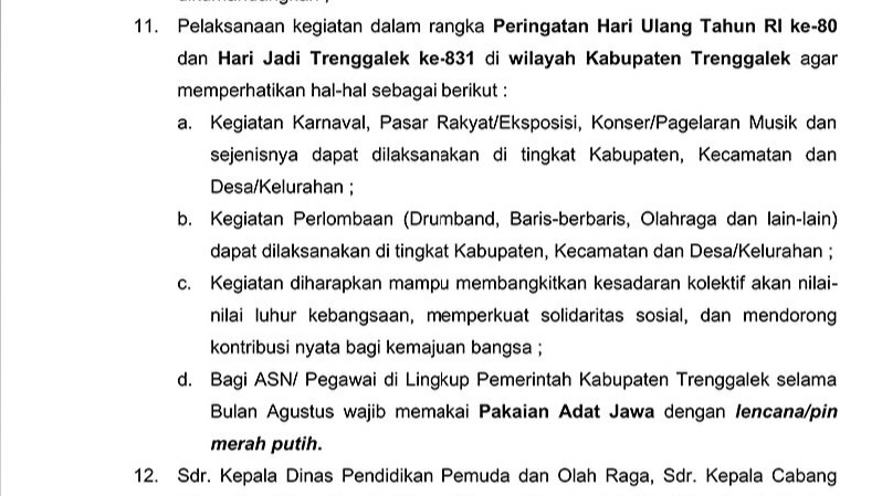 Networkpedia.id – Pemerintah Kabupaten (Pemkab) Trenggalek resmi merevisi Surat Edaran (SE) Bupati terkait pedoman peringatan HUT ke-80 Kemerdekaan RI dan Hari Jadi ke-831 Kabupaten Trenggalek.