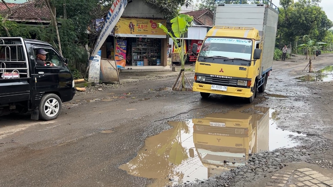 Selain itu, genangan air akibat hujan semakin memperburuk kondisi jalan, membuat pengendara kesulitan melintas.